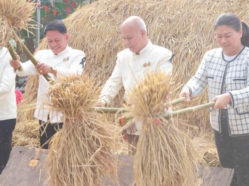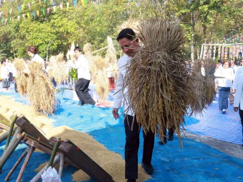 พิธีสู่ขวัญข้าว มีวัตถุประสงค์เพื่อเป็นการบูชาพระแม่โพสพและรำลึกถึงบุญคุณของข้าวตามความเชื่อของชาวอีสาน ไฮไลท์สำคัญของงานอยู่ที่กิจกรรมหลังพิธีสงฆ์ โดย นายสุรศักดิ์ อักษรกุล ผู้ว่าราชการจังหวัดหนองบัวลำภู ได้นำหัวหน้าส่วนราชการและพี่น้องเกษตรกร ร่วมกันลงแรง "นวดข้าว" ตามวิถีโบราณ สร้างรอยยิ้มและความประทับใจให้กับผู้มาร่วมงานเป็นอย่างมาก สะท้อนให้เห็นถึงความผูกพันระหว่างผู้นำกับวิถีชีวิตดั้งเดิมของชาวนาประกอบกับการแสดงศิลปวัฒนธรรมพื้นบ้าน